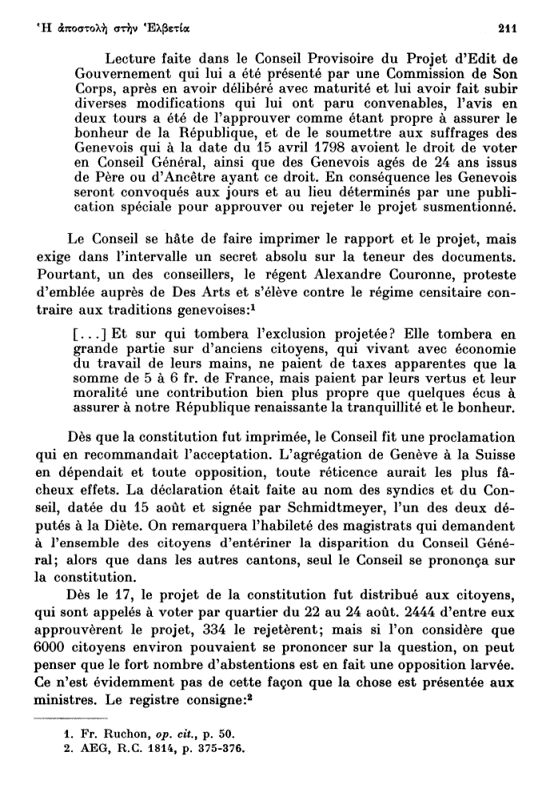 2. ibidem, p. 381. Lettre de Monod au Petit Conseil, datée de Zurich, 24 juillet 1814.